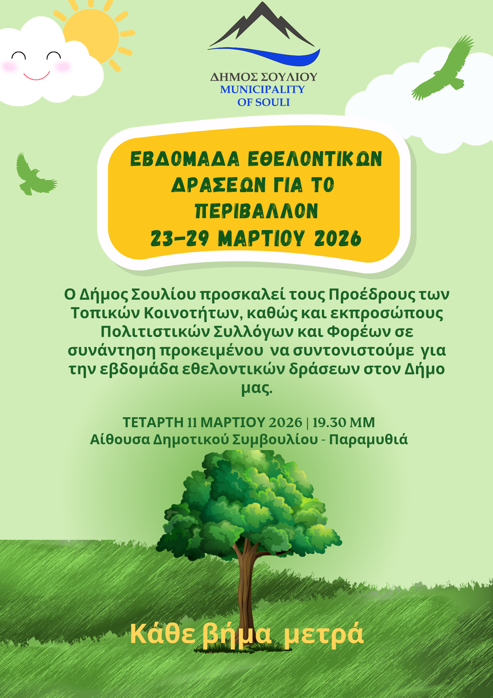 Ο Δήμος Σουλίου προσκαλεί τους Προέδρους των Τοπικών Κοινοτήτων, καθώς και εκπροσώπους Πολιτιστικών Συλλόγων και Φορέων σε συνάντηση προκειμένου να συντονιστούμε για την εβδομάδα εθελοντικών δράσεων στον Δήμο μας (23-29 Μαρτίου 2026).