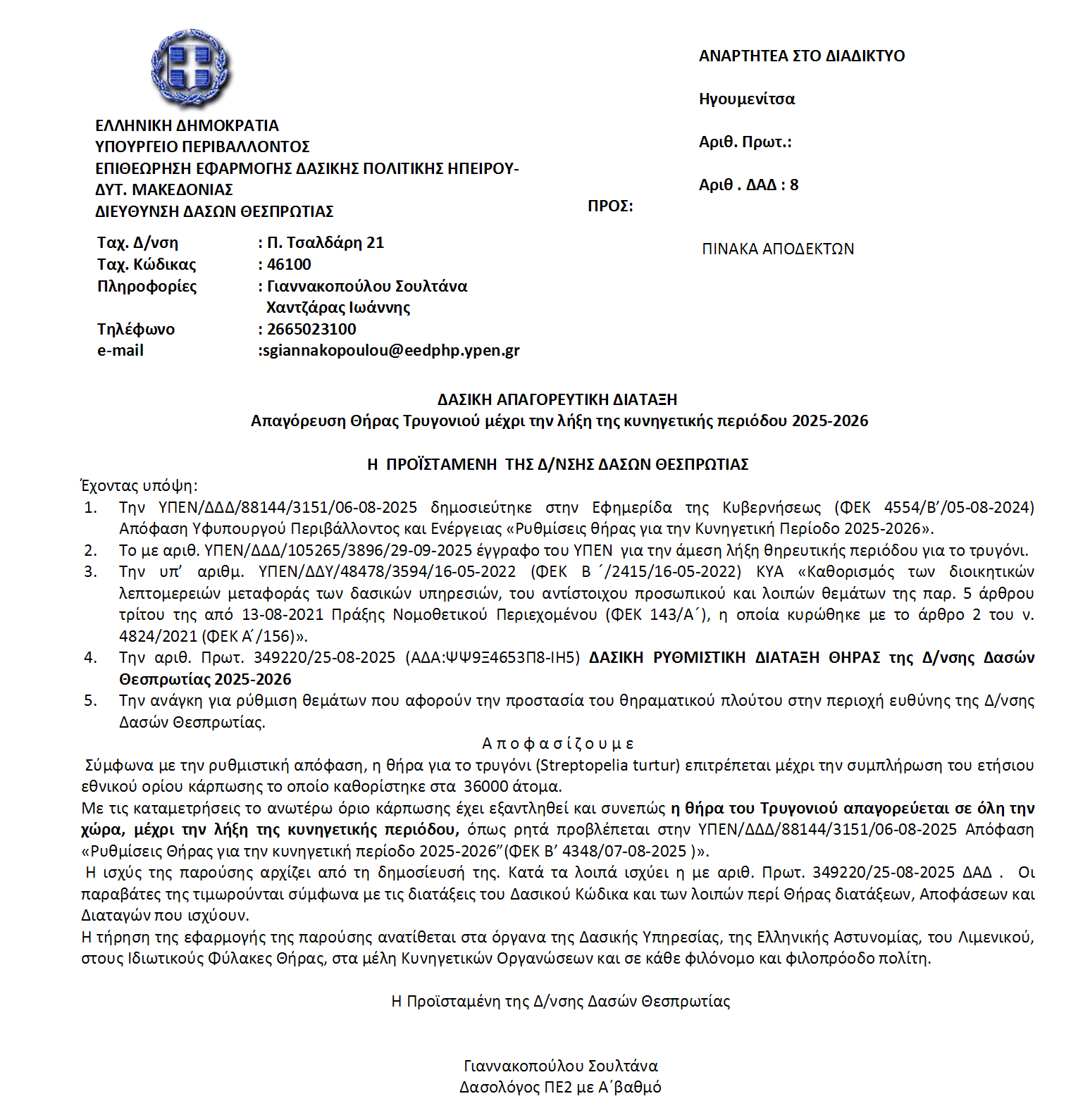 ΔΗΜΟΣ ΣΟΥΛΙΟΥ/ΔΗΜΟΤΗΣ/Ανακοινώσεις/Ανακοινώσεις, Νέα/Απαγόρευση Θήρας Τρυγονιού μέχρι την λήξη της κυνηγετικής περιόδου 2025-2026