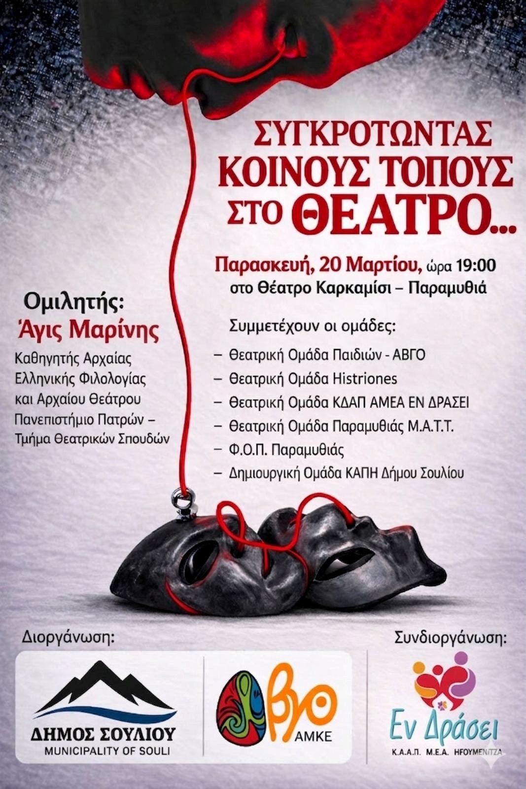 Την Παρασκευή 20 Μαρτίου στις 19:00 το Θέατρο Καρκαμίσι μεταμορφώνεται σε έναν ζωντανό «κοινό τόπο». Κεντρικός ομιλητής της εκδήλωσης θα είναι ο Άγις Μαρίνης, Καθηγητής Αρχαίας Ελληνικής Φιλολογίας και Αρχαίου Θεάτρου του Τμήματος Θεατρικών Σπουδών του Πανεπιστημίου Πατρών. Ο κ. Μαρίνης «συστήνεται» στο κοινό της Παραμυθιάς, γεφυρώνοντας τη θεωρία του θεάτρου με την ουσιαστική, ανθρώπινη εμπειρία της σκηνής.