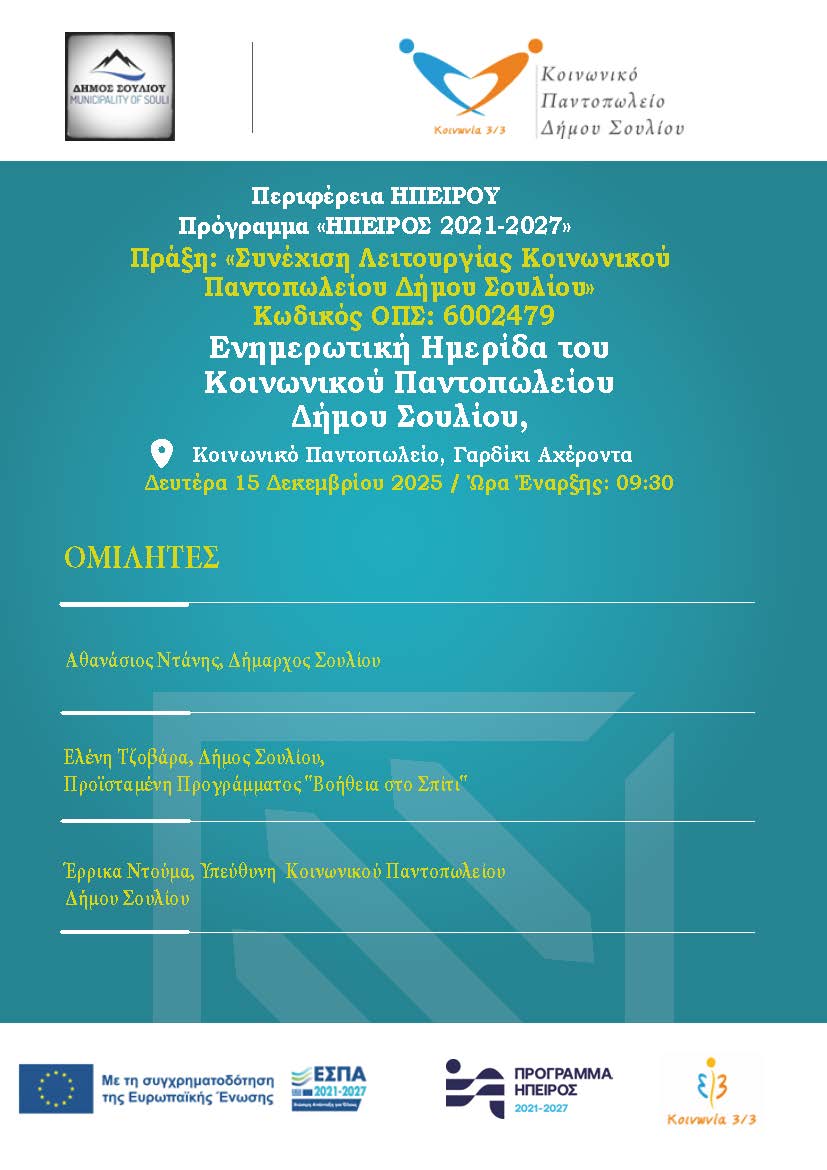 Αλλαγή ημερομηνίας : Ενημερωτική Ημερίδα του Κοινωνικού Παντοπωλείου του Δήμου Σουλίου