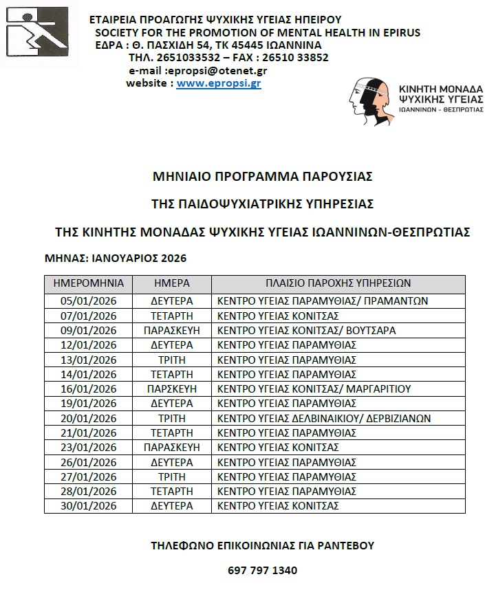 ΔΗΜΟΣ ΣΟΥΛΙΟΥ/ΔΗΜΟΤΗΣ/Ανακοινώσεις/Ανακοινώσεις, Νέα/Μηνιαίο Πρόγραμμα Παρουσίας της Παιδοψυχιατρικής Υπηρεσίας