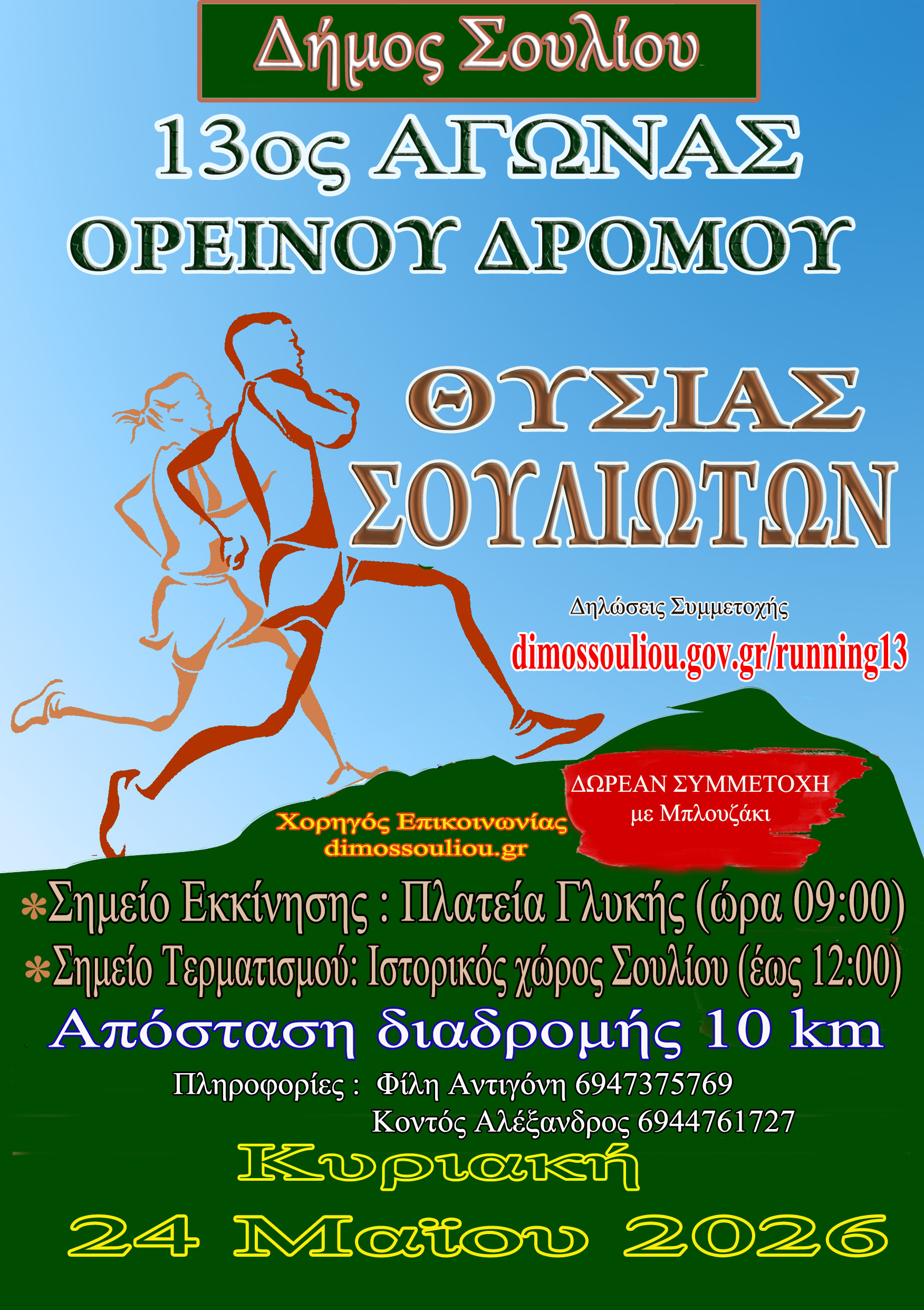 ΔΗΜΟΣ ΣΟΥΛΙΟΥ/ΔΗΜΟΤΗΣ/Ανακοινώσεις/Ανακοινώσεις, Νέα/13ος Ορεινός αγώνας δρόμου Θυσίας Σουλιωτών